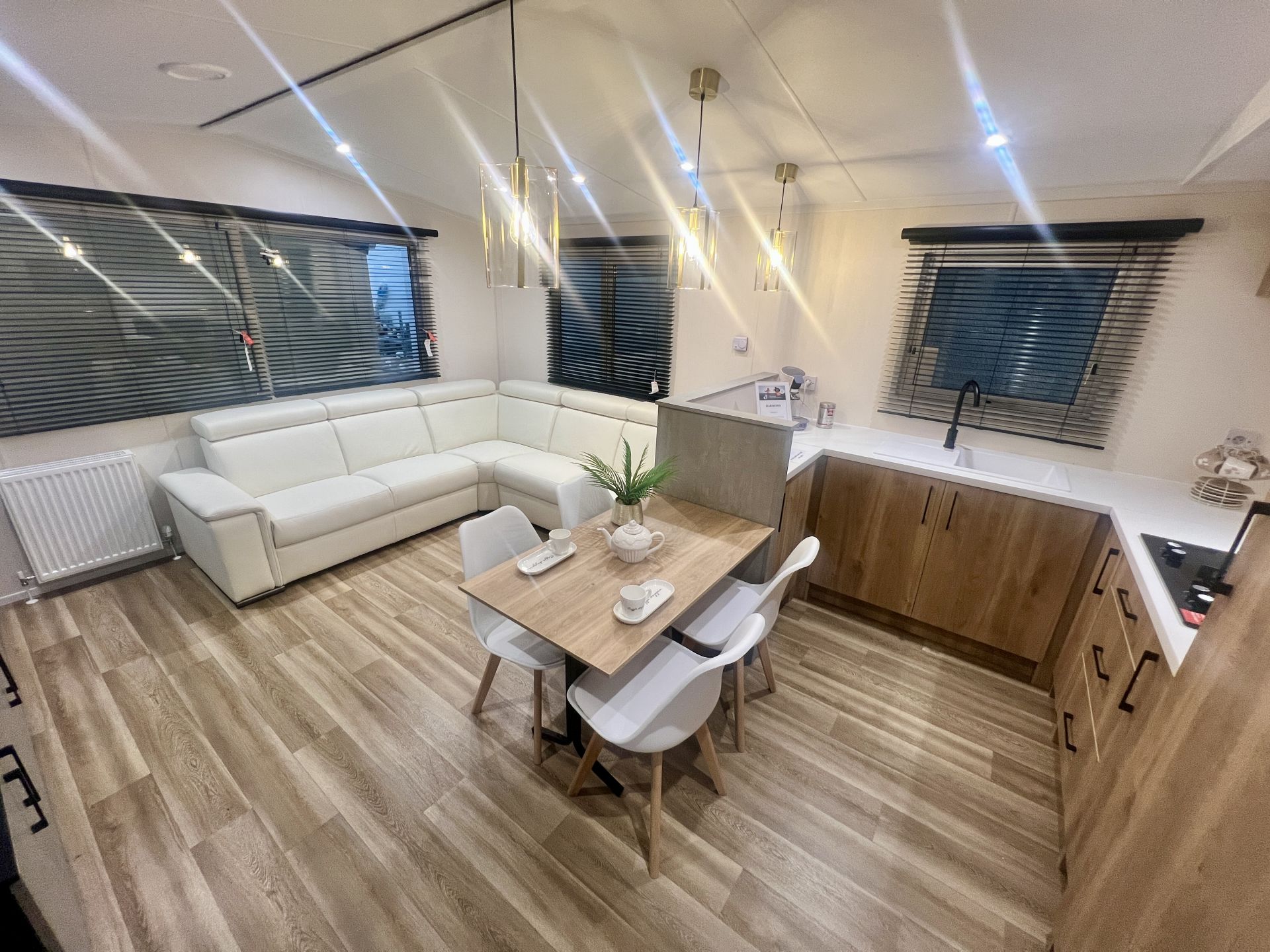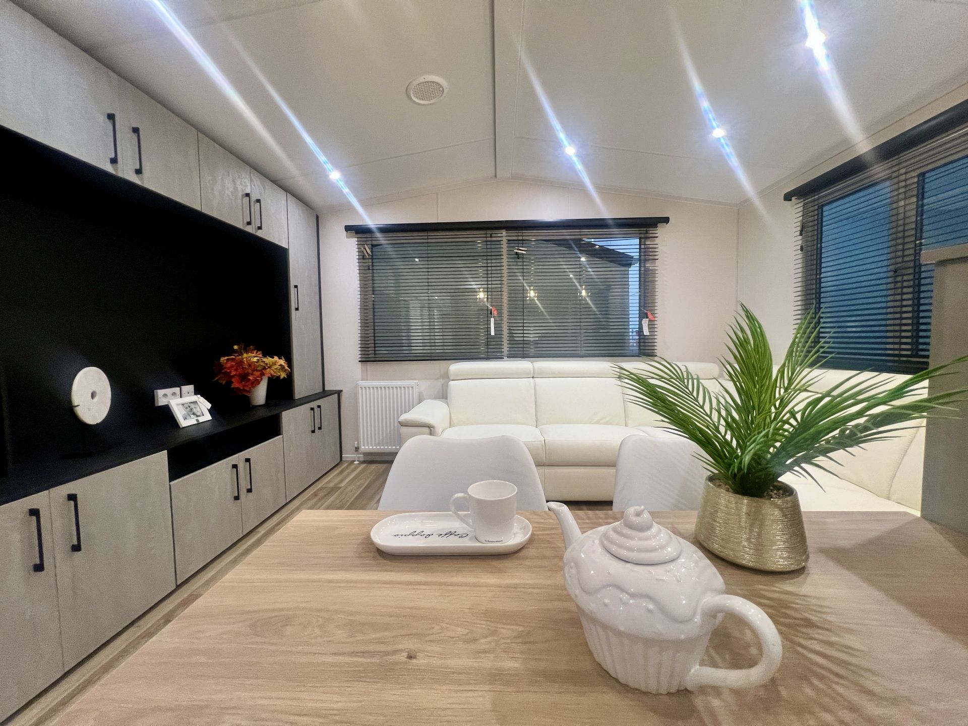 À l'intérieur, le mobil-home est spacieux, avec des aménagements astucieux qui permettent d'utiliser au mieux l'espace disponible. Le salon est agréablement meublé avec des meubles confortables et des décorations modernes. La cuisine est équipée d'appareils modernes, tels qu'un réfrigérateur, une plaque de cuisson et un four à micro-ondes, et offre de nombreux espaces de rangement.